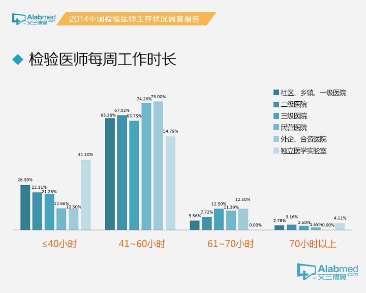 检验医生的工作生活情况检验医生每周工作时间 数据显示,21.96%的检验科医生每周工作时间≤40小时,67.01%的每周工作41~60小时,每周工作时间在61~70小时和70小时以上的分别为8.38%和2.66%。其中特别值得注意的是,独立医学实验室的检验工作者,每周工作时间≤40小时的有41.10%之多,远高于其他单位!(按照医院单位性质划分,检验科医生每周工作时间≤40小时的,社区卫生服务中心/乡镇卫生服务中心/一级医院:26.39%、二级医院:22.11%、三级医院:21.25%、民营医院:12.66%、外企/合资医院:12.50%)