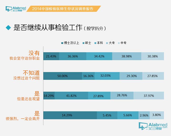 是否有不再继续从事检验工作的打算 对于是否有不再继续从事检验工作的打算,选择“很强烈,一定会离开的”占4.60%,选择“是,但是还在观望”占29.62%,选择“不知道,没想过这个问题”占30.03%,选择“没有,我会坚守这份职业”的占35.75%。按照年龄划分,年龄在45岁以上的检验医生,选择“没有,我会坚守这份职业”的高达63.75%,远高于18~25岁(35.36%),26~35岁(27.54%)和36~45岁(43.52%)年龄段检验医生。