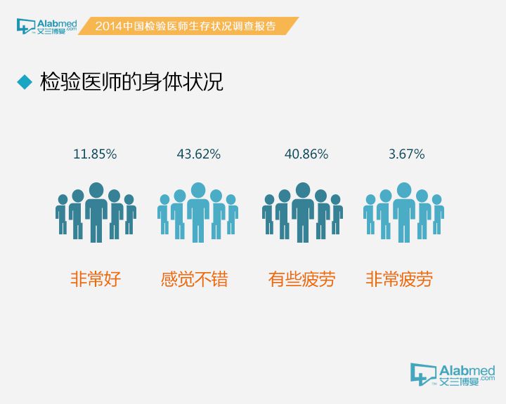 检验科医生的身体状况 对于检验医生的身体状况,认为“非常好”的占11.85%,认为“感觉还不错”的占43.62%,认为“有些疲劳”的占40.86%,认为“非常疲劳”的占3.67%。无论学历、年龄、职称、医院级别、工作年限等,所有人群都介乎于“感觉还不错”与“有些疲劳”之间。
