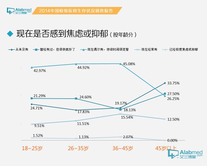 按照职称划分,主任医师/主任技师认为从事的职业“很神圣、非常热爱”的占47.06%,高于副主任医师/副主任技师(22.58%),主治医师/主管检验技师(21.90%),住院医师/技师(23.73%)和实习医生/实习技师(32.93%)。认为所从事的职业“压力非常大,收入与付出不成比例”的,副主任医师/副主任技师占比最高,为32.26%,主任医师/主任技师,主治医师/主管检验技师,住院医师/技师和实习医生/实习技师分别为11.76%,24.51%,24.21%和23.17%。 是否感觉到焦虑或抑郁 是否感觉到焦虑或抑郁?认为“现在偶尔有,持续时间很短暂”的占比最高,为42.90%,认为“已经极度焦虑或抑郁”的占比最低,为1.32%。在45岁以上年龄段中,认为“从来没有”的达33.75%,高于18~25岁,26~35岁,36~45岁年龄组。