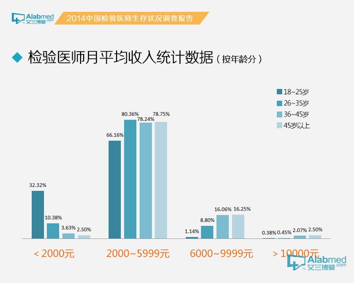 年龄在18~25岁的检验医生月平均收入在2000元以下和2000~5999元的共占到98.48%,上述数据与按照工作年限分类的结果类似。