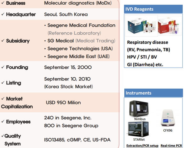 2010年在韩国证券交易市场的KOSDAQ (Korea Securities Dealers Automated Quotations)上市的Seegene是一家为分子诊断和研究应用领域提供PCR技术的公司,其研发的多重PCR技术能够在单一荧光通道中识别多重靶点,然而其尚未在中国开展相关业务。