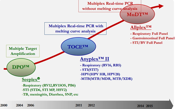 关于Seegene简介(图片来源:Dave(Dae Hoon) Lee演讲PPT) 多重PCR相对于同类产品的优势及主要应用领域?公司产品除了用于检测HPV,是否有意向诊断其他肿瘤类型?如何计划让自己的产品进入中国市场?现有技术在诊断HPV上存在的问题和挑战?HPV诊断对预防HPV有何作用?针对HPV,为什么选择诊断领域而不是研发新药? Seegene公司产品优势 生物技术行业依靠实时PCR作为分子诊断工具至少已有20年,因为它用途广,速度快,容易使用。生物技术行业虽然已做过多次尝试,但仍未取得重大进展,无法用一支试管里有限数量的通道提高多重化和目标量化程度。即便是扩增后的熔解曲线分析也有诸多缺点,如扩增后需要做终点分析,运行时间长,无法量化,探针结合区的目标系列变化引起熔解温度变化。 相比之下,Seegene公司产品能同时检测多个靶体,且灵敏度、特异性和可重复性都较高;产品检测多个病原体可靠性高,通量高,最终为节省时间、人力和费用奠定经济基础。 Seegene公司PCR技术的发展历程