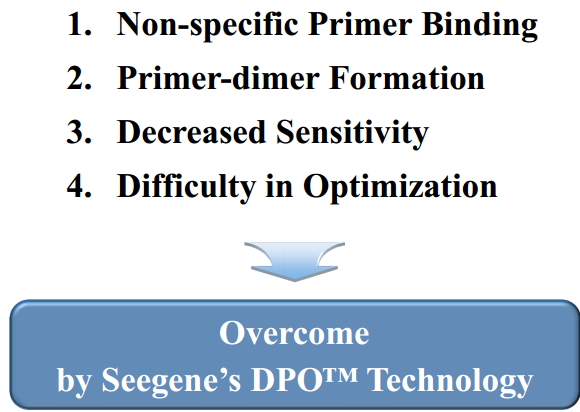 DPO技术克服的技术障碍(图片来源:Dave(Dae Hoon) Lee演讲PPT) Seegene公司的第一代产品——DPO(Dual Priming Oligonucleotide,双寡聚核苷酸引物)技术消除了既往多重PCR容易出现的非特异性扩增和不同长度产物的扩增效率问题,提高了PCR和实时PCR的灵敏度与特异性,使得多病原体的检测成为可能。 Seegene公司的第二代产品——TOCE技术能够在单一荧光通道中识别多重靶点。 Seegene公司的第三代产品——“MuDT”技术是一种实时聚合酶链反应(PCR)技术,它将引起PCR仪器市场的变革。该技术使现有的任何实时PCR仪的多重检测能力加强了一倍,因而最大程度利用了已安装仪器的价值。