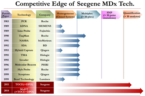 HPV分子诊断趋势(图片来源:Dave(Dae Hoon) Lee演讲PPT) 高度多重通道的real-time PCR技术,一旦成功,该技术能够在一次试验中,完成单一样品中的10种以上的微生物的快速测定和区分。 Seegene是一家跨国公司,致力于开发多重分子技术和多重临床分子诊断产品,这类产品能同时检测多个靶体,且灵敏度、特异性和可重复性都较高。该公司的产品检测多个病原体可靠性高,通量高,最终为节省时间、人力和费用奠定经济基础。 Seegene公司的核心关键技术ACP,DPO,READ和TOCE等,能够保证M-MoDX测试在同时测定多重靶点的时候,具有高度的敏感性、特异性和重复性。Seegene的产品在检测多数病原体时具有极大的可靠性和生产力,能够提供最经济的时间、人力成本。Seegene的目标是在使用分子诊断技术,在传染病、遗传学、遗传病理学和使用革新技术的肿瘤学领域中占据领导地位。 |