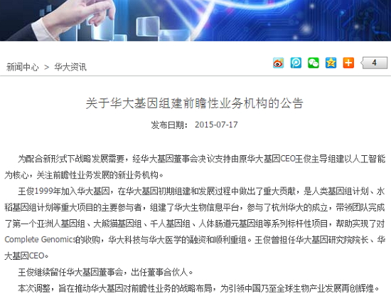 有消息显示,此次王俊离职和其曾想把华大基因和华大科技两个实体合并到一起上市,以至上市失败有密切关系。对于王俊的突然离职,业界人士颇感意外,亦有大部分人表示无法相信。如果王俊离开,谁将承担起继续发展的重任? 除此之外,知情人还爆料,跟随王俊一起离职的,还有华大的“神童”、首席科学家李英睿同学。官方确认:王俊辞去华大基因CEO 根据华大基因官方网站华大资讯发布的最新消息:关于华大基因组建前瞻性业务机构的公告,经华大基因董事会的决议,同意王俊(AEBB-WANGJUN)递交的辞去华大基因集团执行总裁、华大研究院院长及华大股份执行总裁职务的申请。