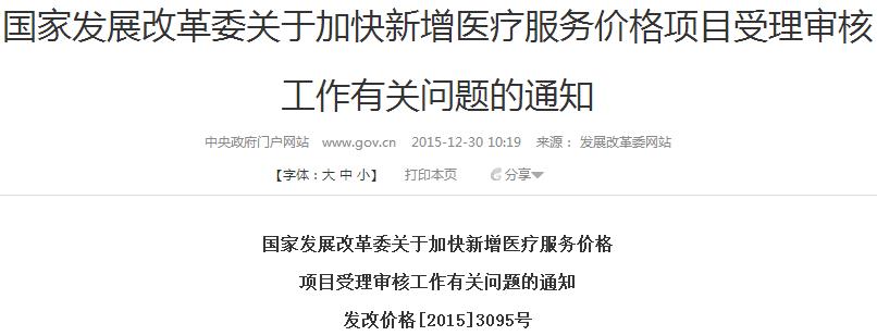 各省、自治区、直辖市发展改革委、物价局: 为贯彻落实《中共中央 国务院关于推进价格机制改革的若干意见》(中发[2015]28号)精神,改进各地对新增医疗服务价格项目的管理,鼓励研发创新,促进医疗新技术及时进入临床使用,营造大众创业、万众创新良好环境,现就加快新增医疗服务价格项目受理审核工作有关问题通知如下: 一、各地受理新增医疗服务价格项目,不受《全国医疗服务价格项目规范(2012年版)》限制。对涉及试剂、耗材和设备等医用产品的项目,只要相关产品获得有关部门批准生产、具备市场准入条件,均应纳入新增医疗服务价格项目受理范围。 二、对有关单位报送的新增医疗服务价格项目,各地要及时受理,高效办理。要进一步简化工作程序,按照鼓励创新和使用适宜技术相结合的原则加快审核,及时公布审核结果。 三、对审核通过的新增医疗服务价格项目,各地要明文规定在本行政区域内执行,并明确项目编码、项目名称、项目内涵、价格水平或价格管理形式等。 四、省级价格主管部门要会同有关部门,抓紧研究制定并向社会公布新增医疗服务价格项目的受理条件、审核程序、审核时间、审核原则及内容和部门职责等工作规则,确保受理审核工作责任明确、过程透明、结果公开。 五、各地不得以任何名义和方式,拒绝或推诿新增医疗服务价格项目的受理审核工作。自本文发布之日起,若因价格主管部门原因影响医疗技术创新和及时进入临床使用的,我委将通报批评,并按规定追究相关人员的责任。 国家发展改革委 2015年12月25日
