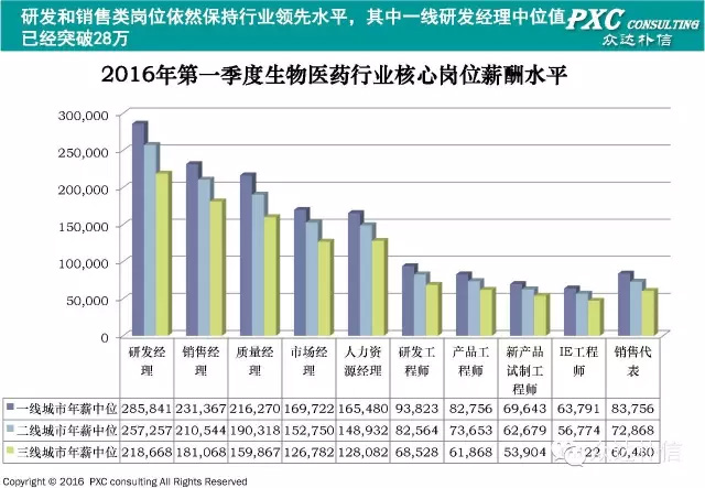 在整个生物医药行业薪酬体系中,研发经理和销售经理都处于领先水平,其中一线城市研发经理年薪范围在25-50万,销售经理在20-45万之间。由此也可以看出,在生物医药领域,产品研发是企业的核心竞争力所在。