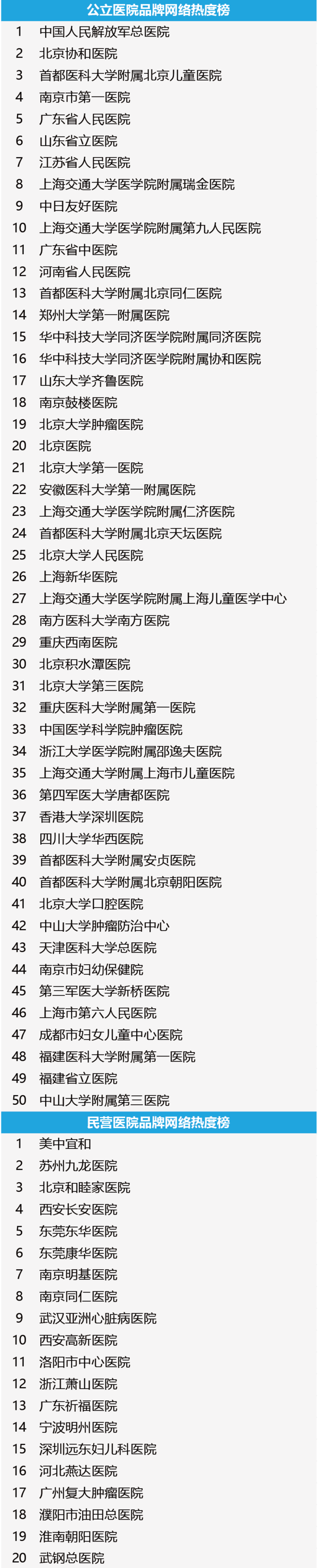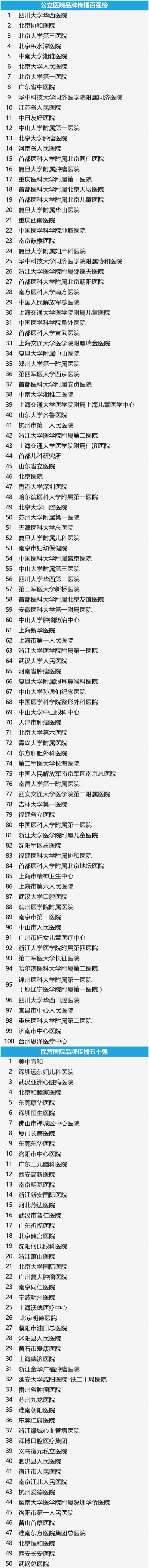新媒体的强势崛起对医疗行业产生了巨大的影响,短短数年,不论是公立医院还是民营医院,大家都纷纷意识到医院品牌传播的力量。微信微博、舆情监测、健康科普等一个不落,一些医院品牌正在冉冉升起。 2016年4月,丁香园携手新榜共同发布「2015医院品牌传播百强榜」,凭借丁香园16年的行业经验和新榜在新媒体数据及算法的积累,为全行业盘点新媒体时代成功铸造医院品牌的王者之师。本届榜单分为总榜:2015医院品牌传播百强榜及四大子榜:2015年度医院卓越微信榜,2015年度医院微博影响力榜,2015年度医院品牌网络热度榜,2015年度医院品牌传播效度榜。 同期,丁香园将在2016年4月13-16日,于杭州举办「2016中国医疗行业品牌传播高峰论坛」,本次峰会看点之一就是医院品牌传播百强榜的颁奖典礼,如果您想了解更多关于榜单背后的故事,敬请关注我们的高峰论坛,点击了解会议详情。 在品牌传播综合实力的较量上,四川大学华西医院、北京协和医院及北京大学第三医院斩获公立医院品牌传播的前三甲。而再看民营及外资医院,美中宜和、深圳远东妇儿医院、武汉亚洲心脏病医院分列冠亚季军。