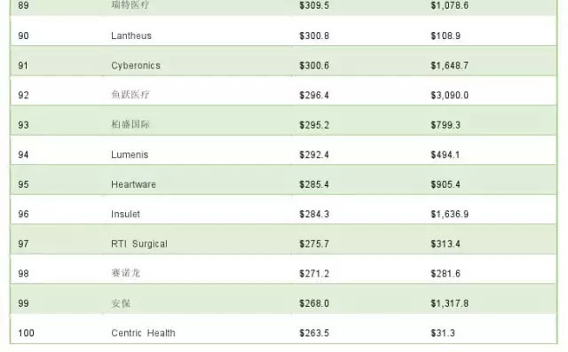 经过几年的并购潮,全球 医疗器械企业的排名已经有了些变化,Qmed为此列出了2015年新的百强排行榜,数据来自标普qixia的S&P Capital IQ数据库。 在这份百强榜中,国内有5家企业入选,分别是深圳迈瑞生物医疗(43)、山东新华医疗(51)、上海微创医疗(80)、北京乐普医疗(81)、江苏鱼跃医疗(92)。 (原标题:2015年全球医疗器械公司100强)