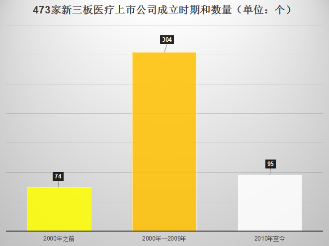 | 随着新三板市场的越发火爆,越来越多的投资者涌入其中。医疗(医药)行业作为其中的热门,以高增长率和良好的市场前景成为各方投资的焦点。截至本月,新三板医疗(医药)上市公司总数为473家,总股本92万8373股。动脉网从成立时间、上市年份、地域分布、主办券商、行业领域等几个方面,对新三板医疗领域公司进行了梳理。 一、成立时间 473家新三板上市企业中,共有74家是2000年以前成立的,有304家是2000年—2009年成立,2010年后成立的有95家。