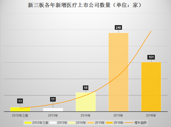 二、上市年份 从时间分布可以看到,2013年以前,新三板新增医疗类上市公司数量都很少,14年开始增速,新增58家公司。15年迎来增长高峰,共有240家医疗企业在新三板上市。2016年增速不减,截至5月底,已经有151家公司在新三板上市。这也说明,医疗企业挂牌新三板已逐渐成为行业趋势,未来有望成为常态。
