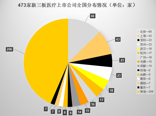 三、地域分布 从医疗类新三板上市公司分布情况可以看出:除北京外,企业主要分布在江浙、珠三角与长江流域的主要城市。北京、武汉、重庆、上海等重工业城市合计占比最高,这与药品生产行业的高占比也有直接关系。