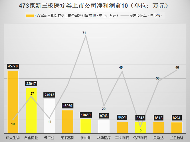七、净利润 在公开数据中,成大生物以4.5亿成为净利润最高的企业,合全药业以3.3亿位列第二。总的来看,由于高利润,各家公司的负债率都相对偏低。值得注意的是参仙源,资产负债率达到了71%,从风险角度来说,后期应适度减少负债,以规避由此造成的企业财务压力。