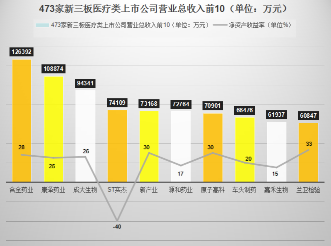 八、营业总收入 营业总收入方面,合全药业、成大生物再次位列前三甲。康泽药业由于营业成本等原因未能入选净利润榜单,但在营业收入榜单上位列第二名。值得一提的是ST实杰,虽然在营收榜中抢下第四的位置,但其净资产收益率为-40%,如果不尽快找到盈利手段,企业将面临退市风险。