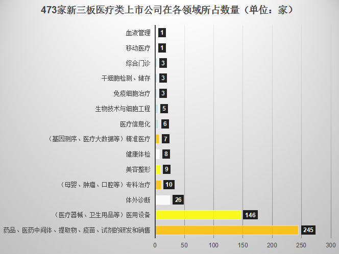 五、医疗领域 从医疗领域分布图可以看到:药品研发、销售类企业依然是新三板医疗上市企业的排头兵,总共有245家;医疗器械、医用设备类企业也稳居其后共有146家;随着体外诊断IVD行业在全球范围内的资本热捧,国内市场即将步入创业蓝海,目前新三板共有约26家企业,由于目前各大投资方对其前景的看好,预计将会在未来一段时间里迎来快速增长期。此外,从数据上看,精准医疗、医疗信息化类前端技术领域企业数量依然有限,尚未迎来行业爆发期。