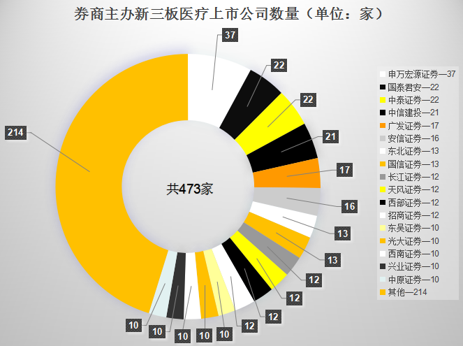 四、主办券商 在新三板医疗上市企业的主办券商里,申万宏源证券成功拔得头筹,共挂牌37家企业;中泰证券与国泰君安共享榜眼之位,各挂牌22家企业;中信建设则以21家屈居第三。
