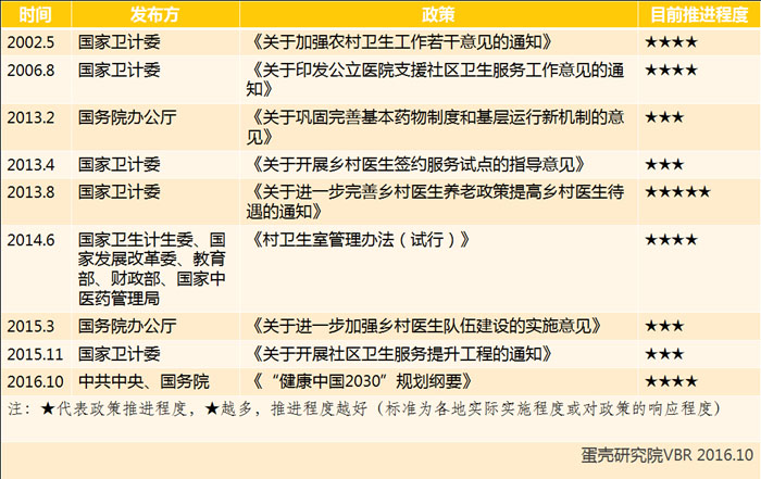 分级诊疗重点政策时间轴 它们分别从乡村卫生服务、社区卫生服务、基本药物制度、甲级医院的角度提出了推进分级诊疗的要求和具体方案。目前,推进程度最好的是关于吸引更多医生走向基层医疗机构的政策。 2015年1月,李克强总理在国务院常务会议上表示,要千方百计提高乡村医生待遇,为他们搭建留得住、能发展、有保障的舞台,使有能力的村医乐意留在农村。为保障乡村医生合理待遇和乡村医生工作环境,我国提出要健全乡村医生补偿政策,将省财政每年补助每个行政村卫生站1万元资金统一补贴公建民营村卫生站。农村地区2015年新增的人均5元基本公共卫生服务补助资金全部用于乡村医生。 对纳入乡镇卫生院编制内管理的乡村医生,在村卫生站工作至退休年龄的按照有关规定参加机关事业单位养老保险并享受相应待遇。未纳入乡镇卫生院编制内管理、与乡镇卫生院建立劳动关系的乡村医生,将参加企业职工基本养老保险。达到法定退休年龄的,按规定享受相应的养老保险待遇,对达到法定退休年龄未缴满15年养老保险继续缴费的乡村医生,根据当地实际情况给予适当补助。