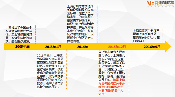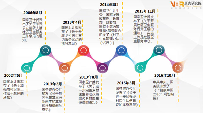 2002年—2016年10月我国每年新出台国家级政策数量图 由上图可知,2002年至2011年,我国每年国家级政策出台的数量较为稳定平缓。2012年至2016年,数量增多,且频率相比前10年大幅加快。分级诊疗成为国家医改的重头戏。 其中主要有9大重要节点: