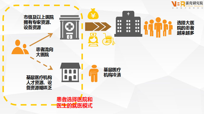 目前面临的问题及解决方法 长期以来,我国形成了患者选择医院和医生的就医模式,且由于城乡之间就医资源差距较大,随着居民收入的增加,经济条件好的患者均形成了无论大病或小病均去市级及以上医院诊治、寻求名医诊治的诊疗习惯。为了追求一定的经济效益,省市级医院凭借相对丰富的资源和技术优势来治疗大病和小病,医院的两极分化也由此逐渐产生。大医院门庭若市,小医院门可罗雀。大医院上大规模、买精设备、扩床位,越来越多的患者前往大医院看病,“虹吸”患者的现象越来越严重。医院与患者在很长一段时间内运行着这样的就医模式,顽固的就医习惯不易在短时间内改变。