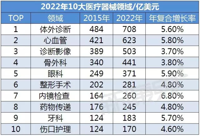 著名咨询公司Evaluateqixia的EvaluateMedTech近日发布了一项对2016年医疗器械行业的总结以及对2022年的展望,报告称2015-2022年医疗器械市场的年复合增长率预计约为5.2%,2022年全球医疗器械市场总容量将达到5298亿美元。