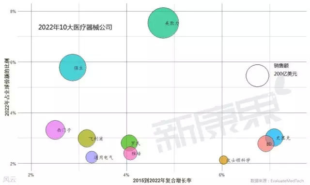 而在公司方面,美敦力仍将保持全球医疗器械销售额的头名,而且优势越来越大,其未来几年的复合增长率接近5%,到2022年销售额将达到399亿美元,强生紧随其后,销售额也将超过300亿美元,强生不愧为全球最大的医药公司,在EvaluatePharma发布的全球处方药销售额中强生以398亿美元位列第5位。而另外一家在制药和医疗器械方面都堪称巨头的公司是罗氏,其医疗器械2022年销售额预测将约为148亿美元,制药方面优势则更为明显,罗氏最近几年药物销售额增长较快,到2022年或将成为全球处方药销售首位。