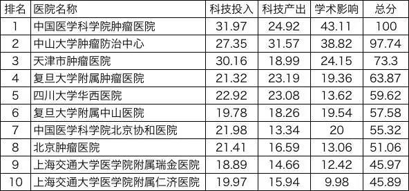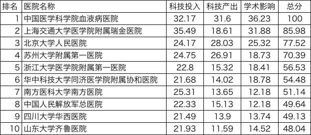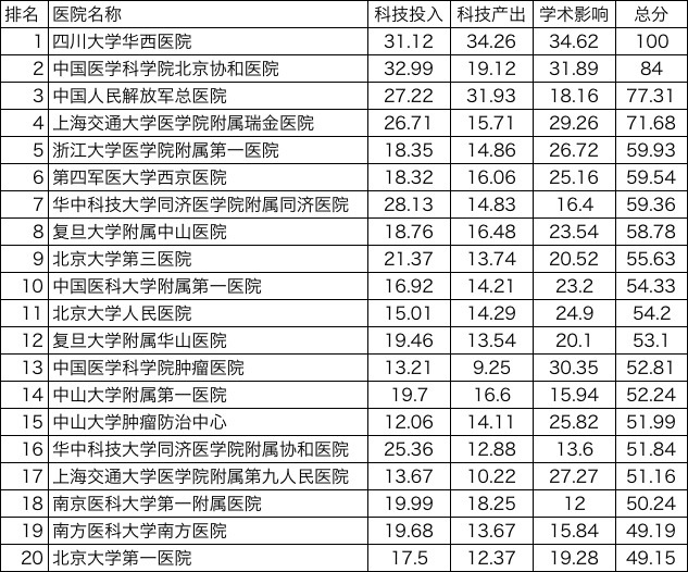 中国医学科学院医学信息研究所发布「2016 中国医院科技影响力排行」,医院综合排名根据每家医院的全部指标数据加权计算;学科排名先将每家医院数据根据国家标准《学科分类与代码》标引到各学科,再将医院各学科数据加权计算,指标体系包括科技投入、科技产出和学术影响。