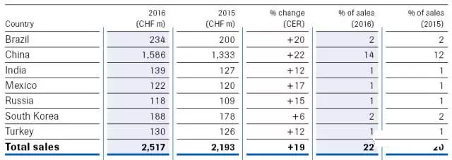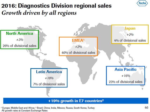 图1. 罗氏诊断业务最畅销产品 (单位:百万瑞士法郎) 从畅销品种可以看出来,罗氏的畅销产品集中在中心实验室,包括免疫,生化,微生物和组织病理诊断,而糖尿病监测产品销售有一些下滑。 区域表现 所有区域均实现不同程度的增长: 北美区域受到糖尿病管理业务降价的影响,但是在实验室诊断业务和POC凝血检测方面表现不错,增速3%; EMEA(欧洲+中东+非洲区域)增速2%,主要得益于中心实验室诊断业务。在非洲,罗氏与政府机构和NGO展开了多项合作; 亚太区域表现不俗,增长16%,对全球诊断业务的增长具有重要意义,其中中国区域的增长占到亚太区域增长的50%以上; 拉美增长18%,日本得益于专业诊断业务,增长2%。