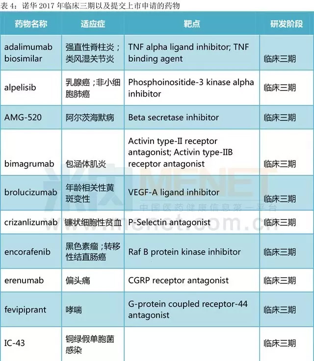 10个药物中,抗肿瘤和免疫调节剂占据最大板块,有抗肿瘤药物、免疫抑制剂各2个,这4个药物均具有重磅炸弹潜力。Guselkumab和sirukumab(免疫抑制剂)已在上文进行了分析,Apalutamide和Imetelstat是具有良好市场前景的抗肿瘤药。Apalutamide用于治疗激素抵抗性前列腺癌,预计2022年市场销售峰值能达到14.5亿美元。Imetelstat 是目前唯一一个在临床研究中显示出客观缓解的骨髓纤维化药物,具有强大的市场潜力,预计2019年能够上市。 NO3.诺华——研发管线涉及多领域,创新药与仿制药齐并进