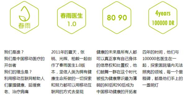 微医是中国领先的移动互联网医疗健康服务平台,由廖杰远及其团队于2010年创建。借助互联网技术,微医为中国上亿用户提供可信赖的预约挂号、在线问诊、远程会诊、电子处方、药品配送等互联网医疗和会员服务。 参考网站: http://www.guahao.com/ 北京春雨天下软件有限公司 企业信息 法定代表人:张锐 注册资本:2332.7197万人民币 公司类型:有限责任公司(自然人投资或控股) 成立日期:2011-07-21 企业地址:北京 经营范围:应用软件服务等 融资信息