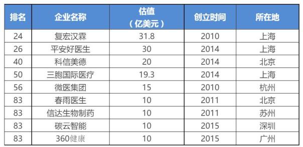 2017年3月1日,科技部火炬中心联合长城企业战略研究所在北京发布了《2016年中国独角兽企业发展报告》及独角兽企业榜单,清科私募通对该报告提供了数据支持。 2016年中国独角兽企业共131家,总估值4876亿美元,分布于18个行业领域,16个城市。其中大健康占独角兽总企业的7%,占总估值的3.2%。列表如下: